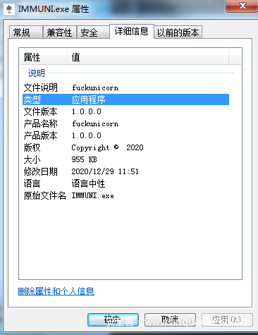 样本是一个 exe 文件,图标带有一个新冠病毒,并且属性中的文件名为“FuckUnicorn”。