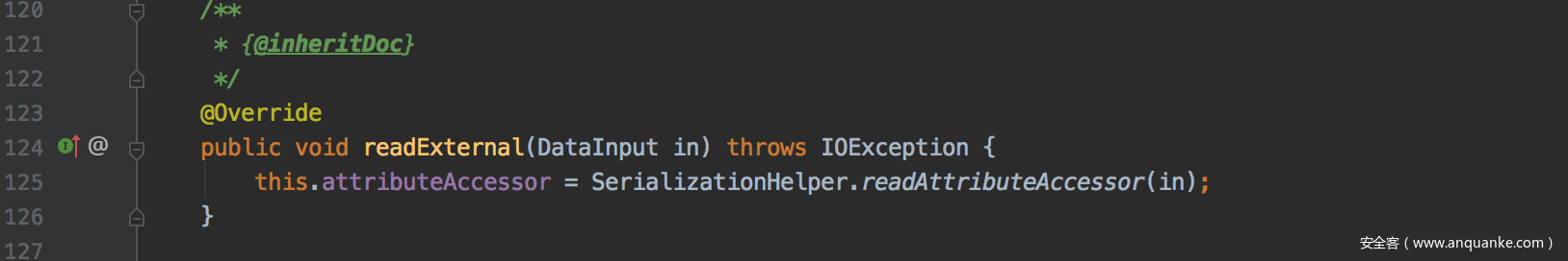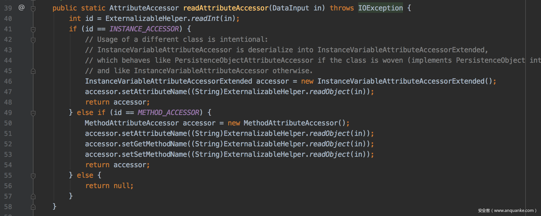 那这里就产生绕过了,虽然LockVersionExtractor和MethodAttributeAccessor类都在黑名单列表里面,但是FilterExtractor类可以替代LockVersionExtractor类,并且在FilterExtractor类的readExternal方法调用了SerializationHelper.readAttributeAccessor,SerializationHelper.readAttributeAccessor方法中又实例化了MethodAttributeAccessor类。