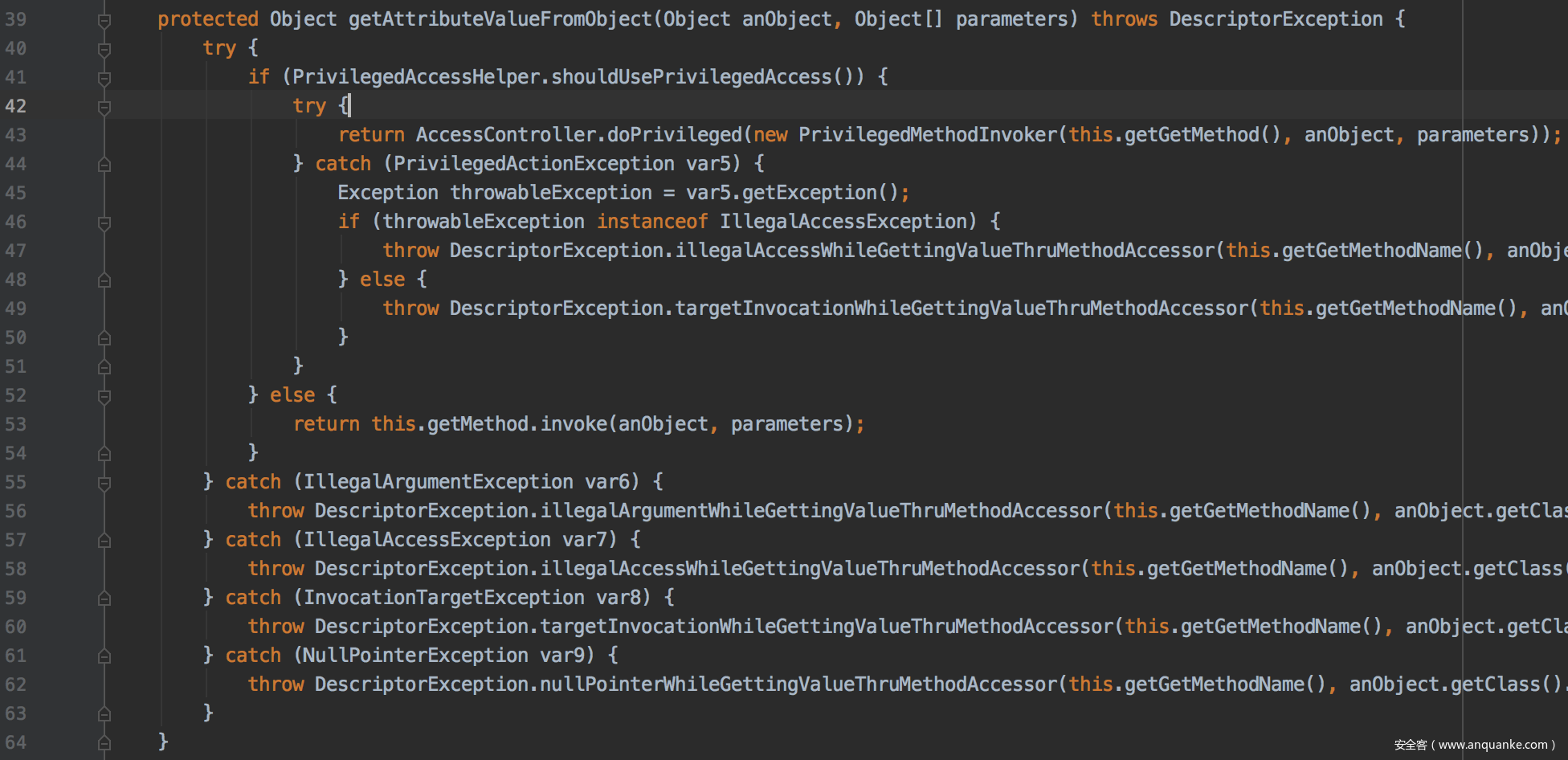 在这个方法中实例化了MethodAttributeAccessor类,在MethodAttributeAccessor类中的getAttributeValueFromObject方法存在反射调用