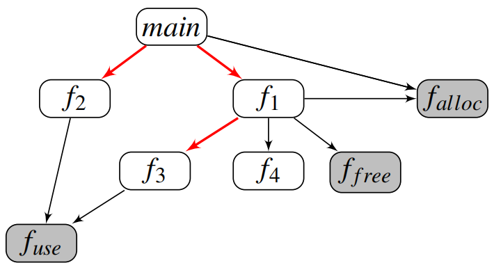 基本块距离db(m,T)是使用从m到“call”指令的基本块的过程内最短路径的长度来定义的,使用包含m的函数的CFG;以及使用调用图从包含m的函数到目标函数Tf(在我们的示例中,Tf是发生use事件的函数)的过程内最短路径的长度。