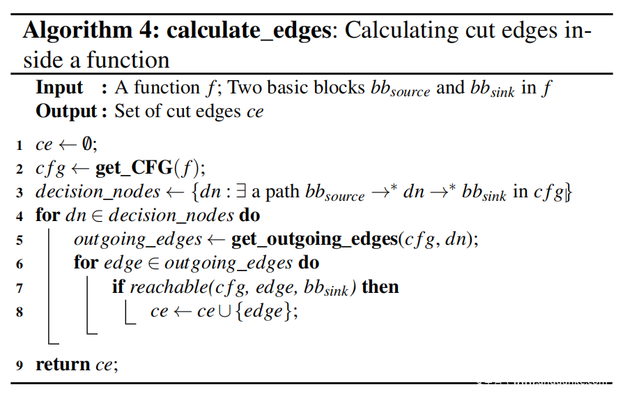 算法4描述了如何在单个函数中计算切边。首先,我们必须收集决策节点,即源和汇基本块之间的条件跳转。这可以通过简单的数据流分析来实现。对于决策节点的每个传出边,我们检查它们是否允许到达sink基本块;哪些可以是切边,其他的则是非切边。注意,这个程序分析是程序内的,所以我们不需要构造一个程序内CFG。