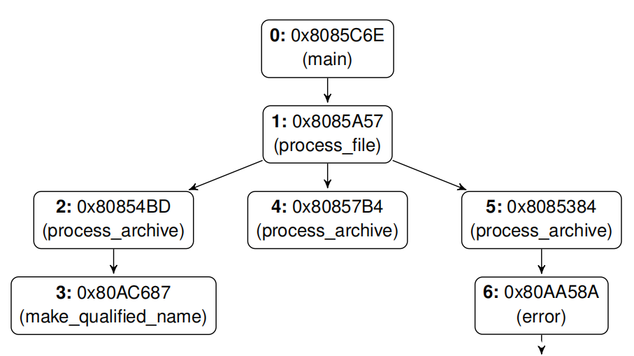 bug跟踪是一系列堆栈跟踪,也就是即它是一个大对象,并不适合灰盒模糊测试所需的轻量级工具。我们需要从bug跟踪中提取的最有价值的信息是遍历基本块(和函数)的序列,这是一个更容易使用的对象。我们称之为提取bug跟踪扁平化。