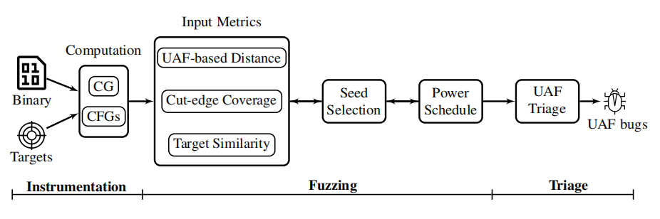UAFUZZ由几个组件组成,包括种子选择、输入度量、功率调度和种子分类。在详细说明这些方面之前,让我们先从方法的概述开始。