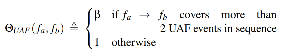 然后,根据边允许覆盖的顺序事件的数量,我们通过降低其权重来优先选择从fa到fb的调用边。在我们的实验中,我们使用以下的ΘUAF(fa, fb)函数,β的值为0.25: