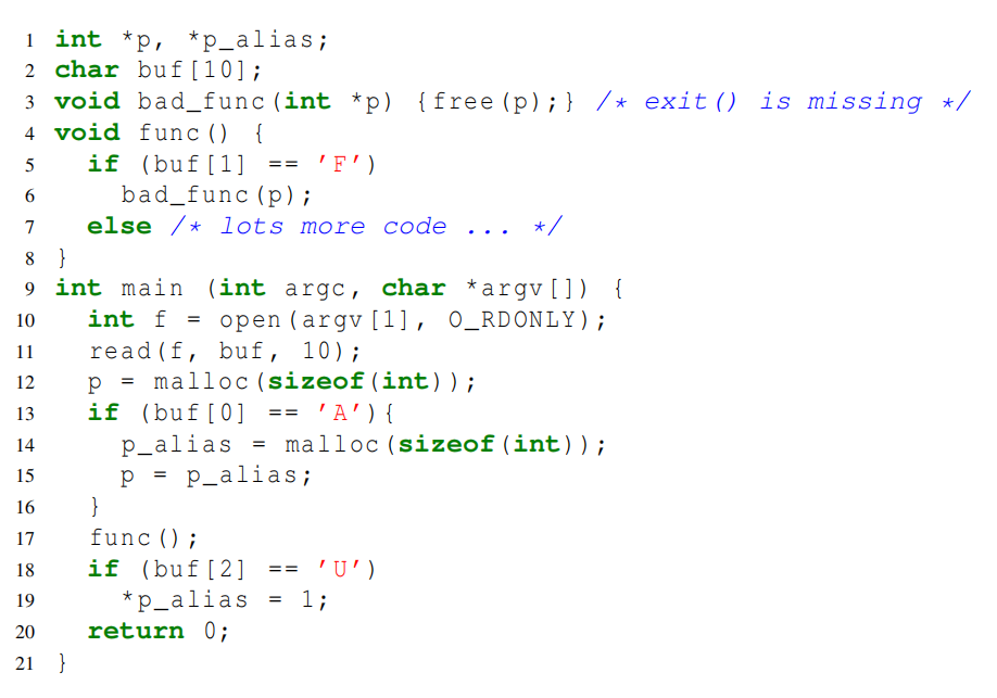 清单2中的虚拟示例包含了一个由于缺少exit()调用而导致的UAF bug, 这是如CVE-2014-9296, CVE-2015-7199等此类bugs的一个常见的根本原因。程序读取文件并将其内容复制到缓冲区buf中。具体来说就是,由p指向的内存块被分配(见第12行),然后p_alias和p就会变成别名(见第15行)。两个指针指向的内存会在函数bad_func中释放(见第10行)。当释放的内存再次通过p_alias被解除引用时,就会出现UAF bug(见第19行)。