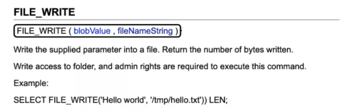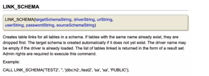 根据公开文档 https://mp.weixin.qq.com/s/hB-r523_4cM0jZMBOt6Vhw ,h2 可以通过 file_write 写文件 , link_schema 底层使用了类加载。