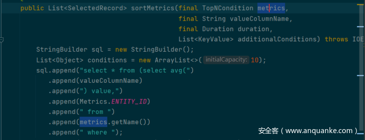 一开始发现一些直接拼接 metrics 的地方,但是并不存在注入,比如 H2AggregationQueryDAO 中的 sortMetrics :