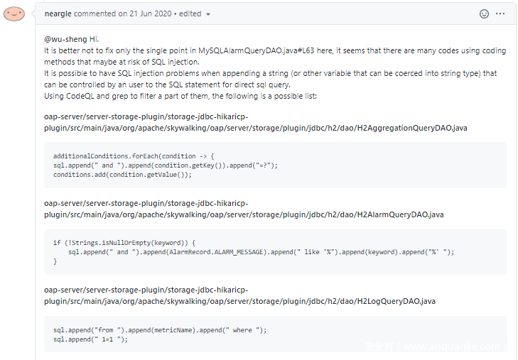 skywalking 历史 sql 注入漏洞有两个,分别是 CVE-2020-9483 和 CVE-2020-13921 ,之前也提到此次漏洞是由于之前两次 sql 注入漏洞修复并不完善,仍存在一处 sql 注入漏洞。我们不妨也来看看这两个漏洞。