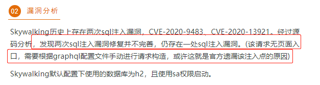 Skywalking 历史上存在两次SQL注入漏洞,CVE-2020-9483、CVE-2020-13921。此次漏洞(Skywalking小于v8.4.0)是由于之前两次SQL注入漏洞修复并不完善,仍存在一处SQL注入漏洞。结合 h2 数据库(默认的数据库),可以导致 RCE 。