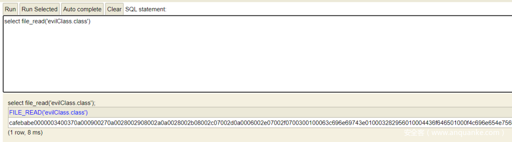 这里写恶意类的时候有个小技巧,可以先在本地安装 h2 ,然后利用 h2 来 file_read 读恶意类,file_read 出来的结果正好就是十六进制形式,所以就可以直接把结果作为 file_write() 的第一个参数