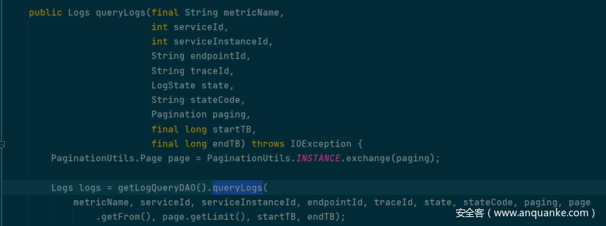 我们向上找调用 queryLogs 的地方,来到 oap-server\server-core\src\main\java\org\apache\skywalking\oap\server\core\query\LogQueryService.java 中的queryLogs 方法: