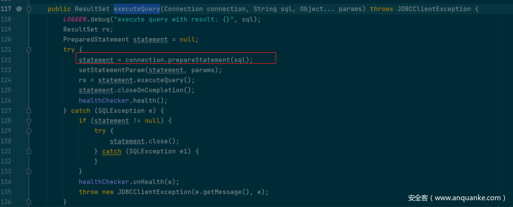 但是这里不能执行多条语句,因为要执行 create 语句的话就需要使用分号闭合掉前面的 select 语句,而我们可以看到执行sql 语句的h2Clinet.executeQuery() 底层使用的 prepareStatement(sql) ,prepareStatementer只能编译一条语句,要编译多条语句则需要使用 addBatch 和 executeBatch 。
