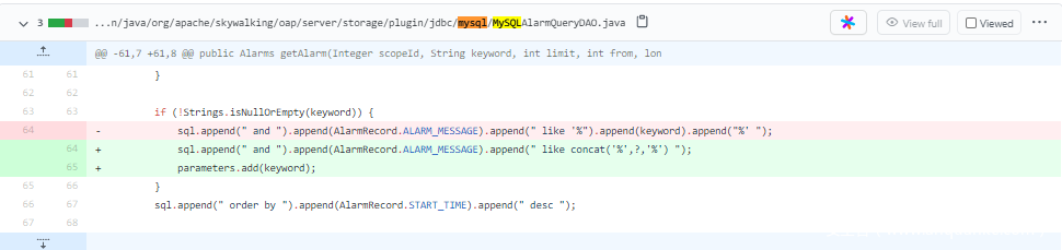 根据 github 对应的 Pull : https://github.com/apache/skywalking/pull/6246/files 定位到漏洞点