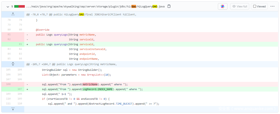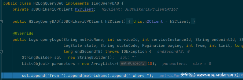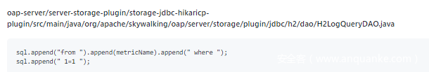 漏洞点在oap-server\server-storage-plugin\storage-jdbc-hikaricp-plugin\src\main\java\org\apache\skywalking\oap\server\storage\plugin\jdbc\h2\dao\H2LogQueryDAO.java 中的64 行,直接把 metricName append 到了 sql 中: