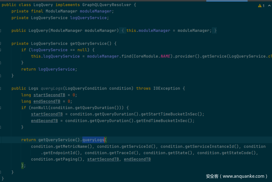 方法所在的类正好实现了 GraphQLQueryResolver 接口,而且我们可以看到传入 getQueryService().queryLogs 方法的第一个参数(也就是之后的metricName) 是直接通过 condition.getMetricName() 来赋值的。