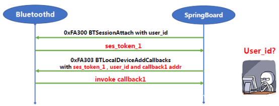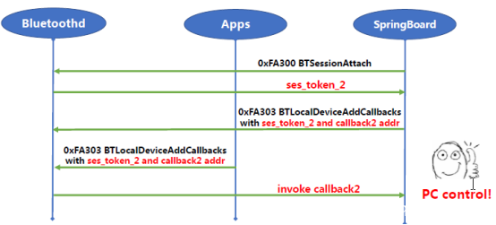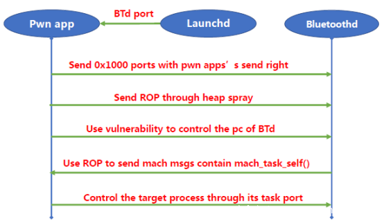 但是,Bluetoothd仅使用会话令牌来识别进程,这意味着我们可以使用沙盒应用程序通过会话令牌来劫持蓝牙和沙盒外的进程之间的通信(CVE-2018-4087)。
