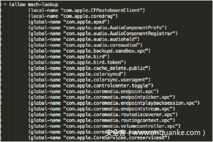 在MacOS中,配置文件可见并存储在/System/Library/Sandbox/Profiles中。在iOS中,配置文件被硬编译到了/usr/libexec/sandboxd中。解码沙箱配置文件很困难,但我们可以遍历所有Mach服务根据返回值获取mach-lookup列表(例如,通过Jonathan Levin的sbtool)。