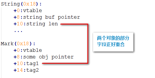 此时就会出现上节IDE中keySet数组里观察到的“异常”数据了,其实从第“10”项开始的垂悬指针指向的新对象就是这里的Mark对象了,该对象与原String对象正好重合(对象大小一样,均为0x18,@银雁冰,多谢纠正),大致内存结构可参考下图