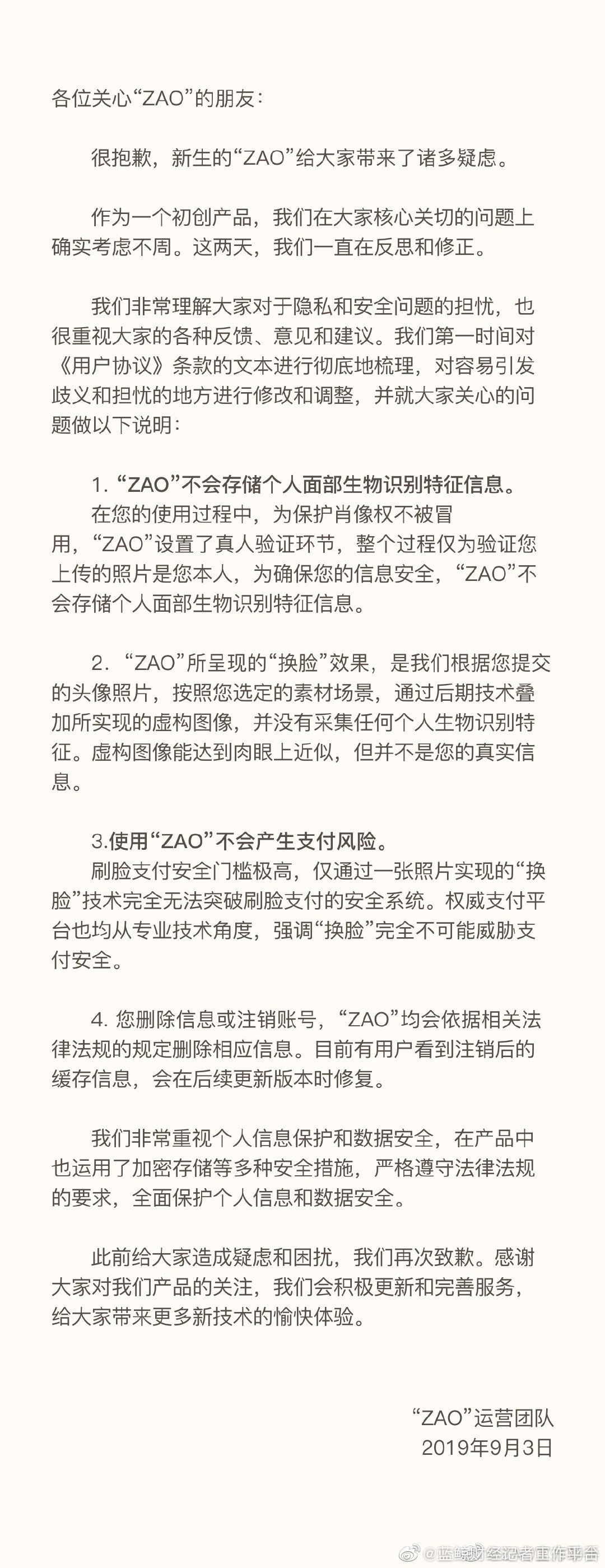 说回ZAO ,在被广泛质疑之后,“ZAO”迅速修改了用户协议,删除了限制用户权利、强制用户无限授权的内容并做出了声明。