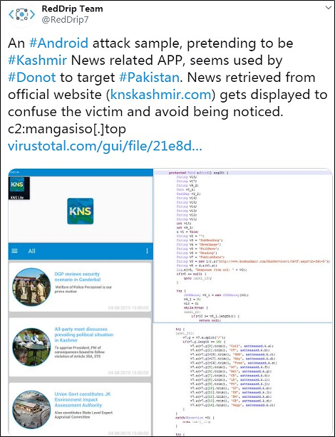 近期,随着印巴在克什米尔地区(Kashmir)冲突的不断升级,具有南亚背景的APT团伙纷纷采用该地区冲突相关信息作为诱饵针对巴基斯坦进行攻击活动。奇安信威胁情报中心刚曝光了摩诃草在PC端利用克什米尔相关信息为诱饵的攻击活动[1],同样具有南亚背景的Donot APT组织也不甘示弱开始展开其在移动端的攻击火力。奇安信红雨滴团队在捕获Donot 移动端新样本的第一时间便对其进行了披露。