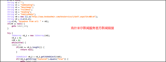 恶意APP运行以后,并没有以往的隐藏自身图标,而是通过仿冒Kashmir News Service(克什米尔新闻服务)展现给用户一个完整的新闻APP功能,从而达到欺骗用户放心使用,更加安全的保存了自身。