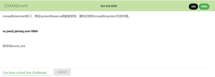 Level5给出的限制的意思是使用mmap分配一块内存,然后使用mprotect改变内存属性为可执行最终达到任意代码执行的目的。由此可以想到的思路是: