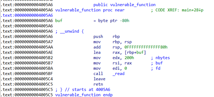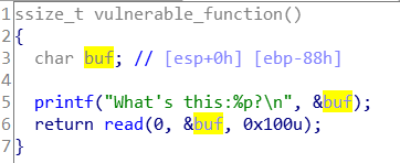 仔细观察不难发现vulnerable_function中调用了read(0,buf,0x200),其中buf的位置是rbp-0x80,从标准输入(fd=0)读取的字符长度为0x200,这样就造成了栈溢出。