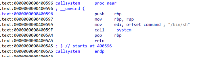 所以构造level0的payload为padding+bp+pc,其中padding覆盖栈空间为0x80字节大小。由于程序开启了nx保护(no execute,代码页不可执行),所以我们不能在函数返回的位置(pc)直接添加shellcode执行任意代码。nx保护一般的绕过方式是代码重用,即利用可执行代码页的代码来达到我们想要的任意代码执行的目的。仔细观察这个题目中有一个函数叫callsystem,跟进发现是一个执行system(‘/bin/sh’)的预置后门,所以我们把pc赋值成callsystem的地址400596即可。