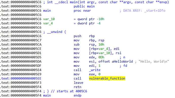 可以看到程序保留了符号表(这里也可以使用IDA的反编译功能F5查看代码,不过为了避免IDA反编译的错误和一些数据类型导致的漏洞建议练习使用汇编查看关键代码),在入口点main函数中先调用write(1,”Hello, Worldn”,0xd)在控制台输出了Hello,Worldn的字符串(在Linux中,文件流fd为0、1、2分别代表标准输入、标准输出和标准错误输出,在程序中打开文件得到的fd从3开始增长);然后将write的返回值(eax)清零,并调用了一个叫vulnerable_function的函数,根据名字可以猜测这个函数是存在漏洞的。