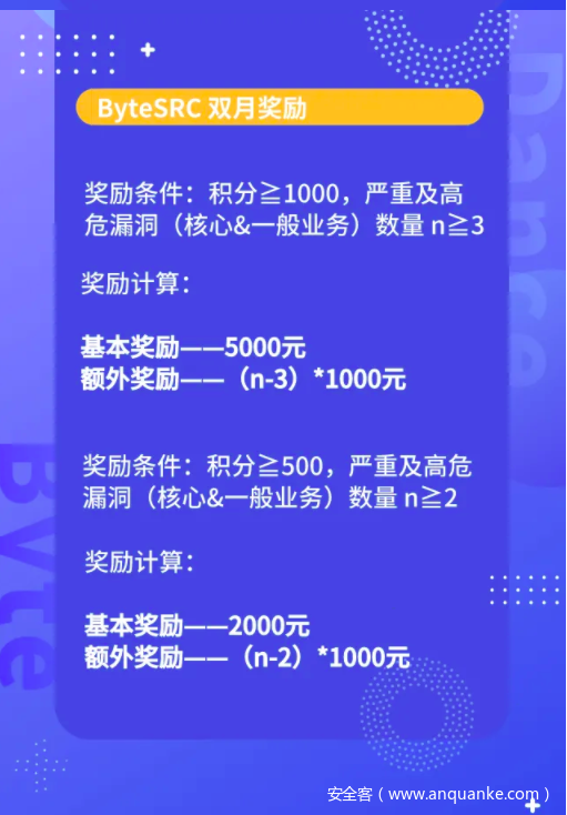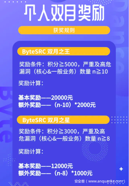 一个Q太久,只争双月的字节人,邀请各位白帽师傅一起加入个人双月奖励计划!从一年4次的季度奖励,更新为一年6次。你的努力和进步,需要早一点反馈。