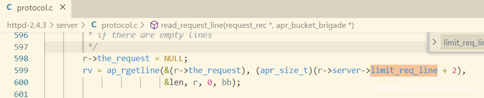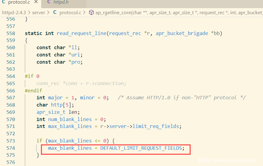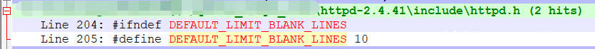 读取请求行时,会跳过blank line,默认为DEFAULT_LIMIT_BLANK_LINES 次 (limit_req_fields没有被初始化),奇怪的是在2.4.3源码中没有搜索到定义值,在2.4.41中倒是搜索到了。