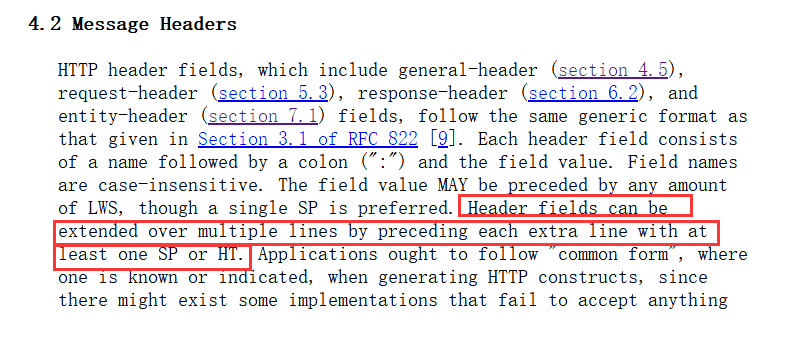 如果一个头部以SP或HT字符开头,表示该头部是上一个头部的extended,或者说是一个continue header line,该行将被合并到上一行,符合RFC。