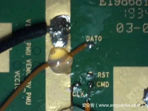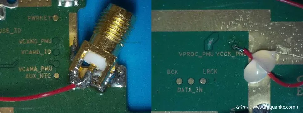 将一个SMA连接器焊接在平板电脑电路板的侧面,然后,通过导线连接到目标焊盘(VCCK_PMU)上。毛刺通过ChipWhisperer的低功耗MOSFET将VCCK_PMU短路到地。通过在极短的时间内降低内核电压,我们期望能够在不让整个系统完全崩溃的情况下,破坏处理器的内部状态(如寄存器的值)。为了访问VCCK_PMU焊盘,我们用小刀从PCB上刮掉了一部分焊膏。除此之外,我们没有进行电路板做任何其他修改(也就是说,去耦电容也不是非去除不可——当然,有时需要去掉)。