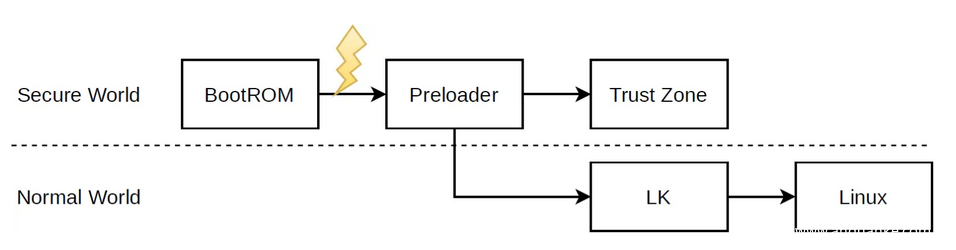 BootROM是引导过程中不可改变的第一阶段,并充当SoC的硬件信任根。与典型的情况一样,这些SoC都包含一个efuse bank,可以在OEM设备制造过程中对其进行配置,以实现安全启动并指定预加载器签名证书的哈希值。在启动过程中,BootROM将读取这些fuse,以确定配置的安全引导策略。接下来,BootROM将把预加载器从eMMC加载到RAM中,并在执行前验证其签名。