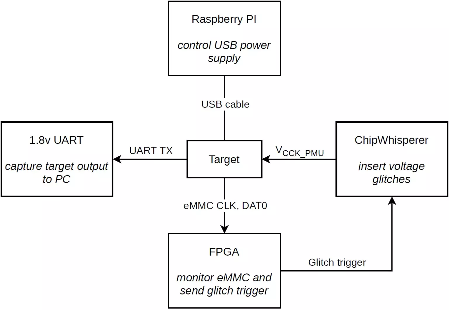 - FPGA:被动侦听eMMC流量,并将毛刺触发信号输出到ChipWhisperer(10加元,Digikey)。