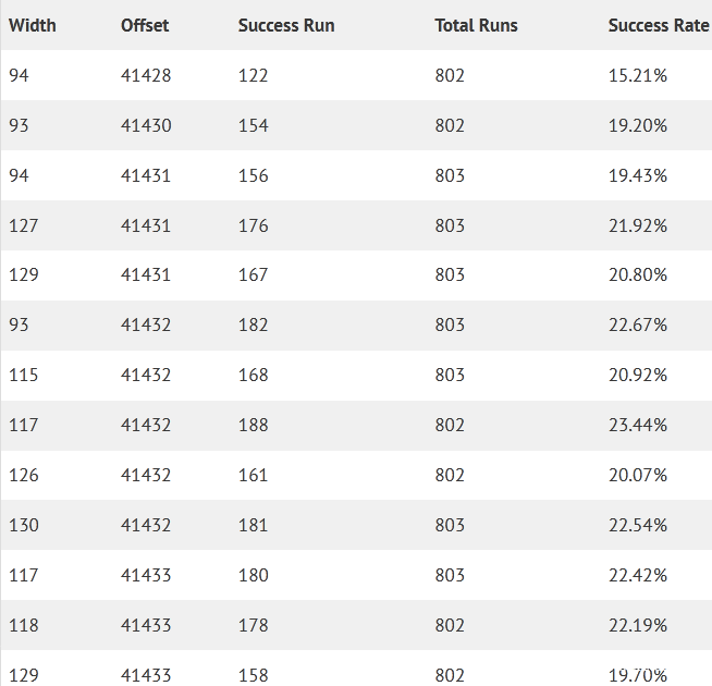 接下来,围绕着这些特定的偏移和宽度,我们继续通过暴力搜索进行微调,以寻找完美的毛刺参数。有了合适的参数,再加上几天的暴力搜索,我们绕过签名检查的成功率逐渐提高到15-20%。下表给出了我们的统计输出,其中有多组参数(宽度和偏移量)能够实现成功的毛刺攻击: