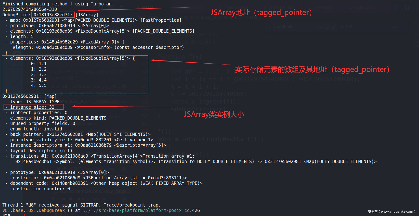 - 需要注意的是,在确定 FixedDoubleArray 与 backing_store 之前的相对偏移时,最好不要使用硬编码。因为如果需要在当前内存段上再新建立一个对象时,原先的相对偏移很有可能会失效;而且不使用硬编码也可以更好的将 exp 从 v8 移植到 chromium上。但不使用硬编码时,使用 for循环结果语句 来循环越界读取数组将会触发一个