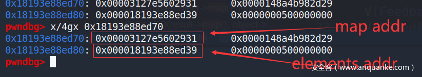 0x40000000字节,有范围限制。// v8/src/objects/fixed-array.h #ifdef V8_HOST_ARCH_32_BIT static const int kMaxSize = 512 * MB; #else static const int kMaxSize = 1024 * MB; #endif // V8_HOST_ARCH_32_BIT看样子我们可以再次声明一个 JSArray ,然后越界修改其 elements 地址以达到任意地址读写的目的?实际上是不行的,因为每一个 element 都有其对应的 map 指针,如果我们要通过修改 elements 地址来进行任意读的话,我们还必须在目标地址手动伪造一个 fake map,但通常我们是没有办法来伪造的。
