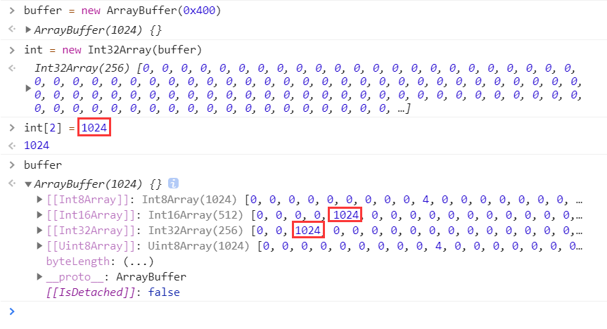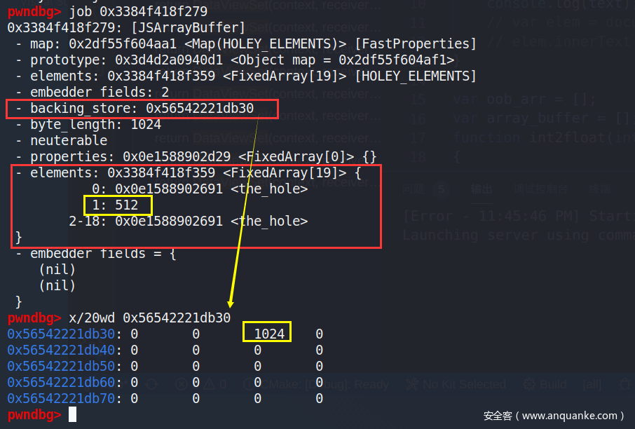 buffer = new ArrayBuffer(0x400); int = new Int32Array(buffer); int[2] = 1024; buffer[1] = 0x200; %DebugPrint(buffer); %SystemBreak();浏览器中输出的结果: