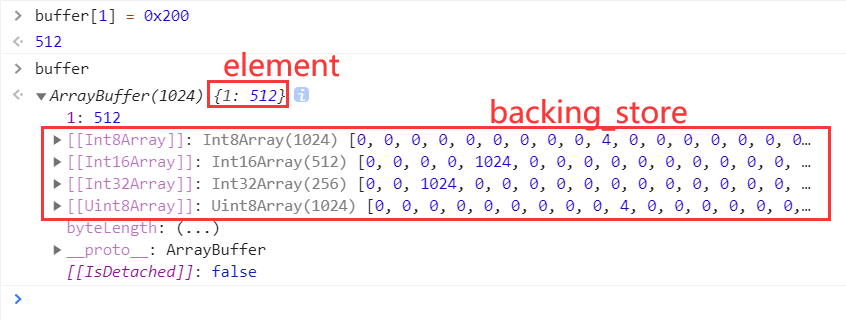 - 需要注意的是,ArrayBuffer 自身也有 element。这个 element 和 backing_store 不是同一个东西:element 是一个 JSObject,而 backing_store 只是单单一块堆内存。 因此,单单修改 element 或 backing_store 里的数据都不会影响到另一个位置的数据。以下是一个简单的 JS 测试代码: