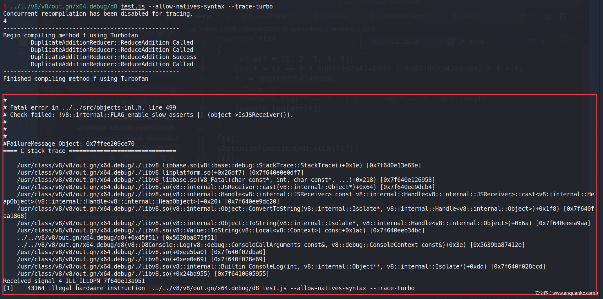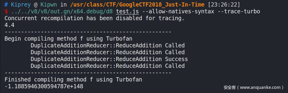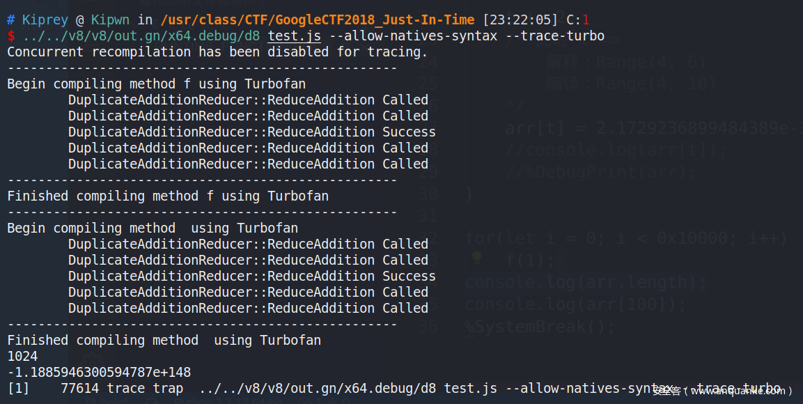 DuplicateAdditionReducer::ReduceAddition Called/Success,是打patch后的输出内容,在原v8中没有该输出。可以看到,成功将两个+1操作优化为+2,并在最末尾处成功越界读取到一个数组外的元素。