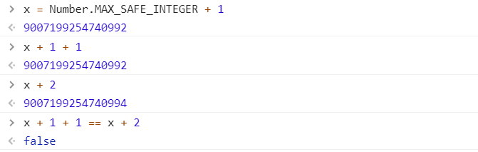 x + 1 + 1不一定会等于x + 2!所以这种优化是存在问题的。 - 这是为什么呢?原因是浮点数的IEEE764标准。当一个浮点数越来越大时,有限的空间只能保留高位的数据,因此一旦浮点数的值超过某个界限时,低位数值将被舍弃,此时数值不能全部表示,存在精度丢失。而这个界限正是 $2^{53}-1 = 9007199254740991$,即上图中的