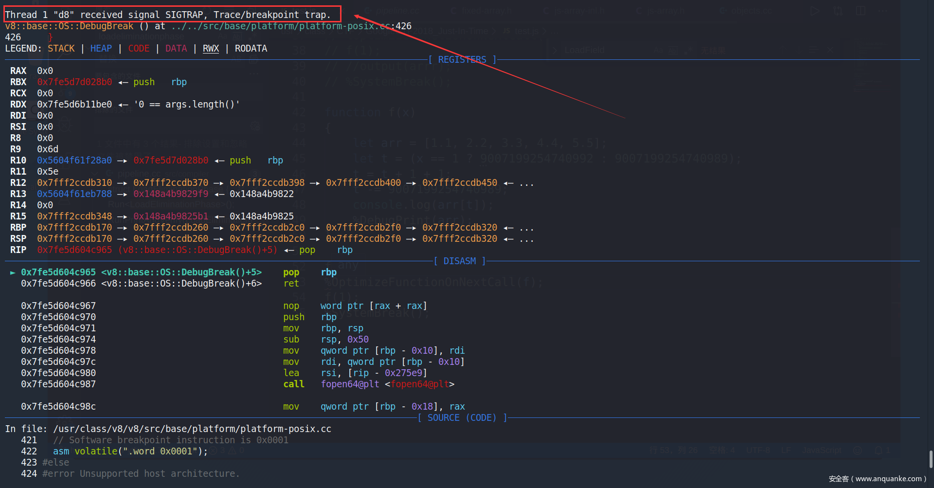 let/var/const修饰词function f(x) { // 错误:arr前没有let、var或者const arr = [1.1, 2.2, 3.3, 4.4, 5.5]; // 错误:t 前没有let t = (x == 1 ? 9007199254740992 : 9007199254740989); t = t + 1 + 1; t -= 9007199254740989; return arr[t]; } console.log(f(1)); %OptimizeFunctionOnNextCall(f); console.log(f(1));问题点:经过gdb动态调试可知,若数组前没有修饰词,则