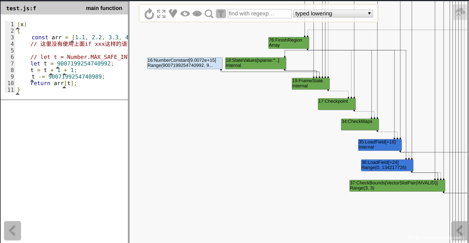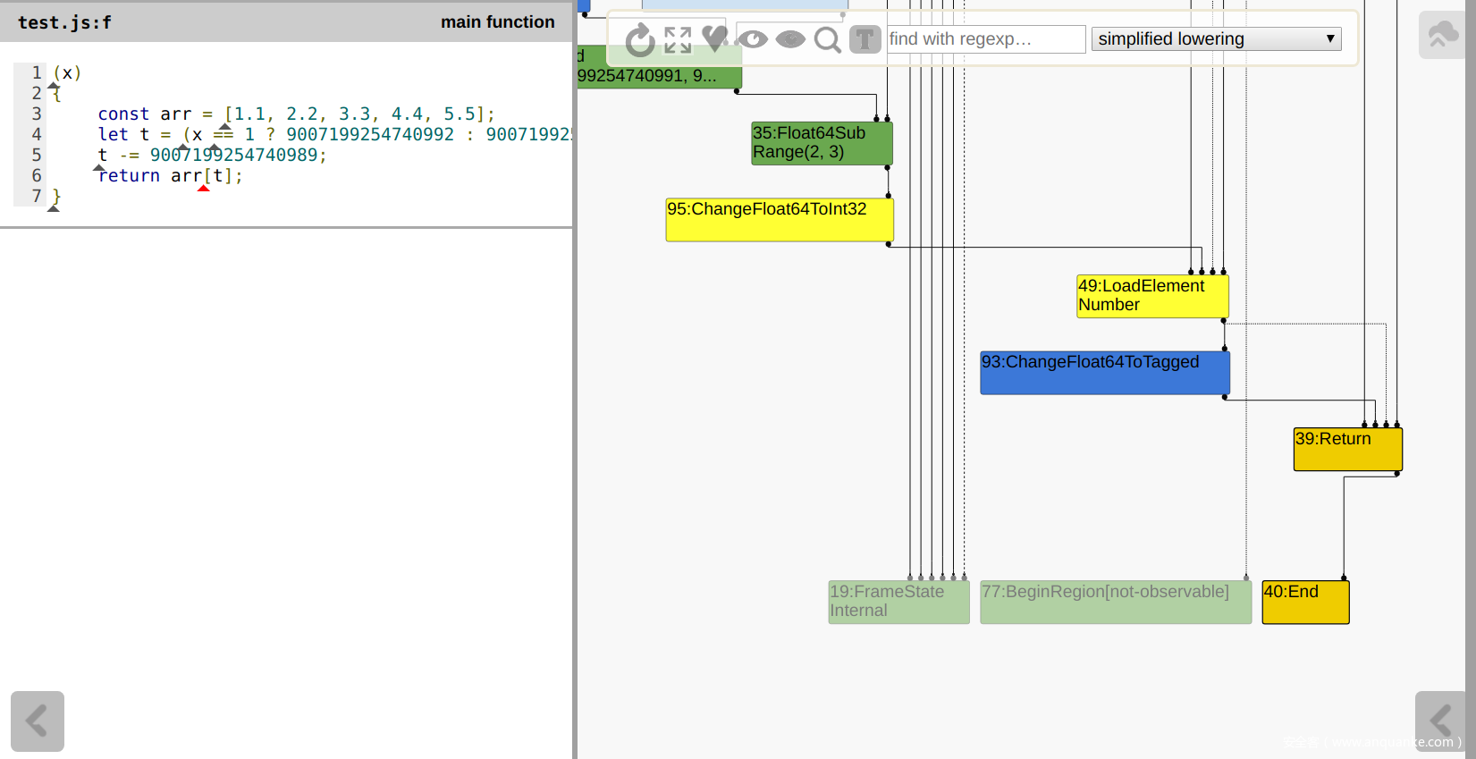 function f(x) { const arr = [1.1, 2.2, 3.3, 4.4, 5.5]; // 这里没有使用上面if xxx这样的语句,直接一个整数赋值 // let t = Number.MAX_SAFE_INTEGER + 1; let t = 9007199254740992; t = t + 1 + 1; t -= 9007199254740989; return arr[t]; } console.log(f(1)); %OptimizeFunctionOnNextCall(f); console.log(f(1));问题点:由于函数中常数与常数相加减,因此在执行